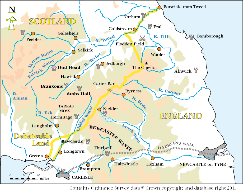 The ballad recounts a cattle-thieving transaction in the Southern Uplands, sometime late in the 16th Century. The Captain of Bewcastle, in northeast Cumbria, is a deputy of the English West March Warden, charged with suppressing rieving raids. But this can't of course apply when he's doing the thieving himself. Luckily, Jamie Telfer, of Teviotdale, has taken out an insurance policy, paying 'black mail' or protection money to local warlord Elliot of Stobs; the deal being that the Elliots will not only refrain from stealing Jamie's cattle themselves, but will also recover them via the conventional 'hot trod' if someone else does.
